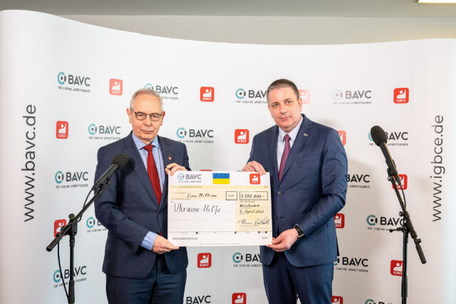 Hilfe für Ukraine: Michael Vassiliadis (links) und BAVC-Präsident Kai Beckmann.